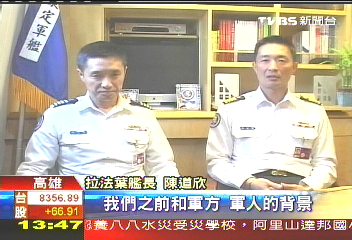 中新網(wǎng)1月15日電 據(jù)TVBS報道,臺灣海軍一級巡防艦艇“拉法葉艦”,有一對同時服役的艦長是兄弟倆,創(chuàng)下臺灣海軍史上的紀(jì)錄。現(xiàn)年43歲的陳道欣和他的弟弟,41歲的陳道輝,先后加入海軍,哥哥在2008年9月當(dāng)上艦長,而弟弟3個月后,在同年12月也當(dāng)上艦長。