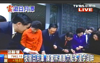 陳云林今天清晨6點多,先是邀約江丙坤共進(jìn)早餐,后來又漫步在日月潭湖畔,欣賞美麗的風(fēng)光。