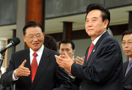 在歡送會上,陳云林和海峽交流基金會董事長江丙坤離情依依。江丙坤表示,“鄭重地向陳會長說一聲再見,后會有期!标愒屏忠矔痴勥^去幾天來的行程,對于臺灣人民,他表達無限感激,并同時向受傷警察致意,他也期盼兩岸的道路,能夠越走越寬廣。
