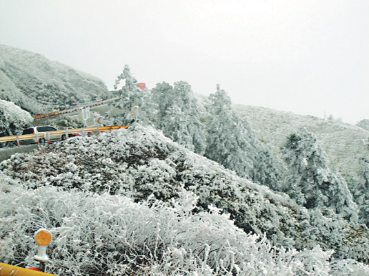 “哇!好漂亮,松樹被寒霜雕成冰晶,是野外自然的圣誕樹”、“鐵杉一身雪白,造形很美”,逾萬游客在昆陽至武嶺路段不斷贊美銀白世界。