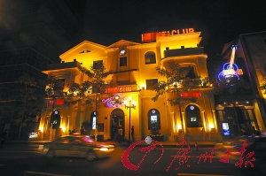 從珠江南岸向北岸遠(yuǎn)遠(yuǎn)望去,這幢新裝修的酒吧格外醒目,建筑屋頂豎起的“HEIHEICLUB”和“喜喜”招牌上,霓虹燈的裝飾閃閃發(fā)光。而在建筑的北面墻體上,整幅墻體布滿酒吧的招牌。很難相信,這樣一幢充滿商業(yè)氣氛的建筑,就是昔日肅穆的黃埔軍校駐省辦事處、黃埔軍校同學(xué)會(huì)、中國(guó)青年軍人聯(lián)合會(huì)舊址。