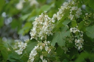 油桐樹開的花,被愛花人昵稱“桐花”,花開時(shí)白花成簇堆聚綠葉上頭,有如冬雪輕覆枝頭,加上花朵隨風(fēng)吹飄落,模樣更像是雪花,因而贏得“夏雪”美名,雖然四月便見桐花開,但因盛花期落在五月間,又有“五月雪”的封號。