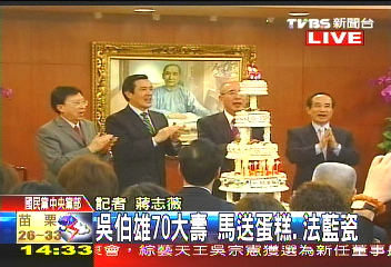 慶祝吳伯雄70歲大壽,包括馬英九、劉兆玄、王金平等人都到場致賀,給足面子,而馬英九也送上5層樓高的蛋糕,以及一個上面寫著“伯雄中興”的法藍瓷,國民黨“立委”洪秀柱更獻吻祝福。