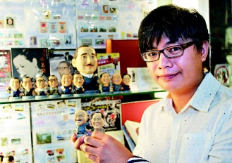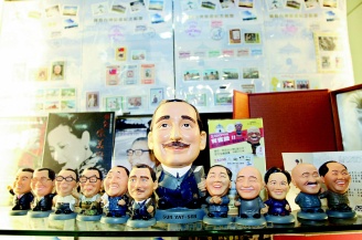 什么商品最受陸客歡迎?吳松洲指著玻璃柜里一排“政壇明星公仔”,包括抱黑貓白貓的鄧小平、手拿十大建設(shè)藍(lán)圖的小蔣,還有馬英九、蕭萬長等,笑說這是店里的“招財(cái)貓”,許多陸客一買就是二十幾個(gè)。