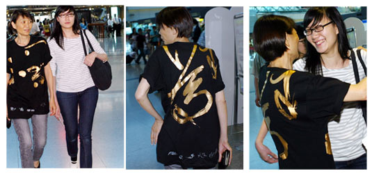 中新網(wǎng)6月29日電 據(jù)臺灣《聯(lián)合報》報道,馬英九夫人周美青27日晚送小女兒馬元中搭機回美國穿了件草書T恤,捧紅了這件臺北當代藝術館為“無中生有”特展設計的T恤,民眾踴躍搶購,館方已準備加印。