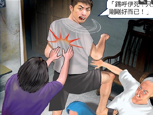 沈父倒在地上不斷哀號(hào),在房?jī)?nèi)睡覺的沈弘隆姑姑趕緊跑出來(lái)察看,大喊:“不要打了!”一把將侄子推開說:“當(dāng)兒子的,怎么可以打老爸!钡蚝肼∈ダ硇,還回嗆姑姑說:“踢呼伊死(指沈父)!只是剛剛好而已!”甚至拉開姑姑,再踢了父親一腳,才掉頭逃離現(xiàn)場(chǎng)。