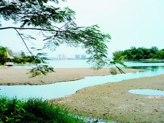 澄清湖因高屏溪原水濁度太高,且攔河堰抽水設(shè)備受損,已十天無(wú)法進(jìn)水。水位從滿(mǎn)水位銳降至十六點(diǎn)五米呆水位,有效蓄水量?jī)H剩四十多萬(wàn)公噸,水庫(kù)處處可見(jiàn)裸露底泥的大片沙洲。