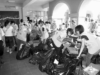 在熱心志工的引導(dǎo)下,我們進(jìn)入旗山社會福利館。這兒似乎被一個社會團(tuán)體的志工包下了,統(tǒng)一的黃色馬甲顯得整齊,記者在人群中明顯不一樣。一間大房間作為庫房,不同的物資碼放整齊。更多的人忙著將一袋袋捐贈衣物分門別類,新的舊的,長的短的,厚的薄的,男的女的,然后消毒、打包、標(biāo)號,送往災(zāi)民安置點。