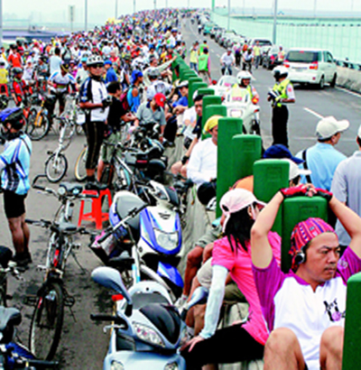 縣政府原計(jì)劃將無(wú)車日活動(dòng)設(shè)在板橋文化路的捷運(yùn)新埔站,要車友在這里集結(jié)上橋,后來(lái)報(bào)名參加車友實(shí)在太多,昨天緊急調(diào)整通車典禮會(huì)場(chǎng)至臺(tái)64線道路的16.3公里處,也就是五股交流道附近。沒(méi)想到清晨4時(shí)起就有車友成群結(jié)隊(duì)上橋,卻在16.3公里處被擋駕,他們耐心等候7時(shí)30分通車典禮,沒(méi)想到因人太多,近七萬(wàn)車友和愛(ài)車就硬被堵在高架橋上。