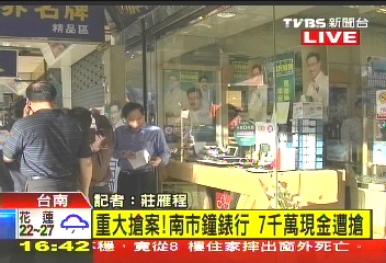 中新網(wǎng)11月23日電 據(jù)臺灣TVBS報(bào)道,臺南市一家鐘表行老板,23日下午到銀行提領(lǐng)新臺幣7000萬元現(xiàn)金,準(zhǔn)備買黃金用,沒想到回家途中遭歹徒尾隨,回到店內(nèi)時歹徒開槍搶走現(xiàn)金,流彈還意外波及在店內(nèi)的老板侄女,侄女小腿中彈,送往成大醫(yī)院急救,歹徒則逃逸無蹤。