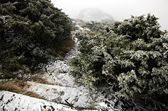 至于賞雪圣地合歡山,16日只在上午8時(shí)短暫下了夾雜雨水的雪,落地即融化。今天則在凌晨2時(shí)左右間歇性飄雪,武嶺至合歡山莊一帶山壁可以看到約1公分的積雪。