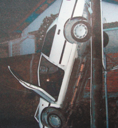 但因?yàn)樗菚r(shí)已經(jīng)喝茫,加上天雨、視線不清楚,且車(chē)尾面對(duì)陡下坡,竟然就這樣沿著電線桿的接地線開(kāi)上電桿、發(fā)出“碰”一聲巨響,整臺(tái)車(chē)頭下腳上倒立、貼在電桿上,兩人簡(jiǎn)直嚇壞了。幸好前座在下方,兩人趕緊開(kāi)車(chē)門(mén)出來(lái)。