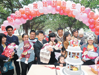 桃源鄉(xiāng)梅山、梅蘭及勤和村的災(zāi)民,自從災(zāi)后下山,有7名婦女生產(chǎn),還有3名婦女也已屆預(yù)產(chǎn)期。昨天高雄縣長(zhǎng)楊秋興在災(zāi)民重返家園前,為7名一出生就待在安置中心的嬰兒慶生,并迎接即將出生的娃娃。