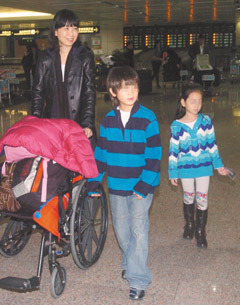 周慧婷日前因?yàn)椴瓤账畠貉劢鞘軅、兒子骨折,一個(gè)人得拄著拐杖想辦法打包所有行李,左腳摔傷的周慧婷昨坐輪椅下飛機(jī),提領(lǐng)6件托運(yùn)行李后,直接坐上租用的廂型車(chē),再一路照料兒女飛回臺(tái)灣。由于金溥聰?shù)蒙习,加上周慧婷班機(jī)提早半小時(shí)抵達(dá),她人都上車(chē)走了,金溥聰才到。還是記者們見(jiàn)他撲空,立刻提醒他:“你老婆走了耶!”他才急忙把老婆叫回機(jī)場(chǎng),一家4口在車(chē)上團(tuán)員。
