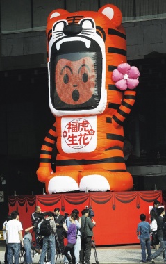 即日起,民眾經(jīng)過市府前,將會看到2只可愛又招福氣的“開心福虎”。一只趴在市府大門樓上,一只在市府大門口,手上都拿著花朵,造型相當(dāng)卡哇伊,宛如守護神般陪伴民眾度過虎虎生威的新年。;⒃O(shè)計者李明道表示,市府大門口的開心福虎高9.5公尺、底座寬6.3公尺,手拿美麗花朵意味今年底“花博會”將在臺北登場,開心;⒌哪槻垦b有LED熒幕。