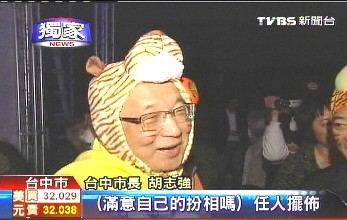 臺中市長胡志強(qiáng)扮成老虎,并圍上一條“老虎圍巾”,所有參加臺中燈會的貴賓坐在位子上整齊劃一,不論穿的是西裝還是休閑服,都在脖子上加了條亮黃色圍巾……這是臺中市府的創(chuàng)意,圍巾左右兩邊是老虎尾巴,做成英文字母T,代表臺中Taichung,還有老虎Tiger。