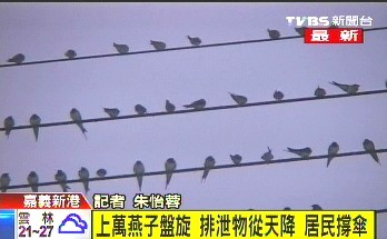 中新網(wǎng)4月6日電 據(jù)臺(tái)灣TVBS報(bào)道,嘉義新港地區(qū)最近出現(xiàn)大批燕子聚集,昨天(5日)是清明節(jié),數(shù)量更超過5萬只,引起當(dāng)?shù)鼐用駠^。居民說燕子多好像是代表福氣來,不過排泄物卻讓他們很困擾,出門都要撐傘,以防被鳥屎擊中。