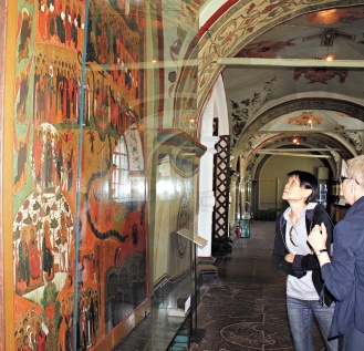 周美青在俄方人員陪同下參觀了修道院,并進(jìn)入院內(nèi)的一間教堂,她對(duì)教堂內(nèi)東正教的圣像畫特別感興趣,其中一幅壁畫“末世的審判”描繪東正教里人與天地的關(guān)系,以及天堂與地獄的對(duì)比,周美青在壁畫前駐足良久仔細(xì)欣賞,似乎對(duì)東正教信仰有所體會(huì)。