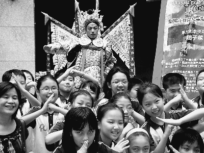 工作人員在旁講解:馬歇·馬叟是法國默劇大師;莎士比亞是英國文藝復(fù)興時期杰出的戲劇家和詩人;趙子龍是三國人物,這是趙子龍在京劇中的扮相,趙子龍是武生,扮相俊逸,身段威武穩(wěn)健……三個人物配合講解,擺出各種動作,小朋友們聽得津津有味!芭!”“趙子龍”身邊的標(biāo)示牌不知何故忽然倒下。一個小朋友立刻解釋:“趙子龍不愧是武生,用氣功就可以把牌子推倒!”此言一出,“趙子龍”都忍不住了,跟大家一起哈哈大笑。