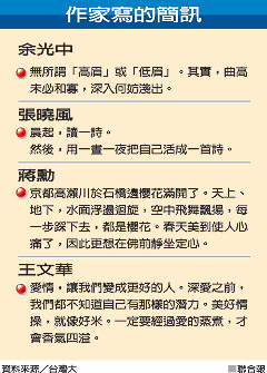 較少發(fā)短信的作家張曉風,昨天特別用短詩“用一晝一夜把自己活成一首詩”,示范短信該有的“簡潔卻深刻”,王文華贊美張曉風,生活俯拾都是詩,但多數(shù)人“把自己活成尸”,再次引來滿堂笑聲。