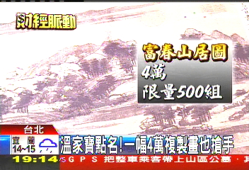 中新網(wǎng)4月24日電 據(jù)臺灣TVBS報道,2010臺北禮品展開跑,臺北故宮今年第3次參展,也是規(guī)模最大一次。此次臺北故宮特別把溫家寶提過的富春山居圖制作成復(fù)刻板,限量500套,雖然一幅4萬元(新臺幣,下同),但一開賣就被訂走50套。