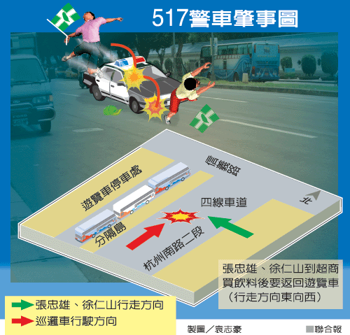 張忠雄、徐仁山在跨越杭州南路車道時(shí),突遭同由杭州南路南向北行駛的巡邏車撞上,張忠雄被撞后彈落到巡邏車擋風(fēng)玻璃上,再滾落地面。由于撞擊力大,巡邏車的擋風(fēng)玻璃碎裂,原本行駛在內(nèi)側(cè)第二車道的巡邏車,也偏向最內(nèi)車道緊急煞車。