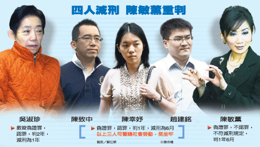 中新網(wǎng)9月2日電 據(jù)臺(tái)灣《聯(lián)合報(bào)》報(bào)道,陳水扁女兒陳幸妤、女婿趙建銘、兒子陳致中因偽證罪被判刑六月,雖不能易科罰金,但可以易服社會(huì)勞動(dòng)。檢方表示,未來原則上會(huì)核準(zhǔn)趙建銘、陳幸妤聲請(qǐng)義診替代服刑,但法律勞務(wù)暫不需要,因此陳致中可能被安排清潔小區(qū)。