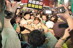 當(dāng)時(shí)馬英九步行,沿路與商家住戶打招呼,拜托支持邱鏡淳,這個(gè)時(shí)候民進(jìn)黨提名候選人彭紹瑾,也在謝長廷陪同下從學(xué)府路往建新街方向掃街。