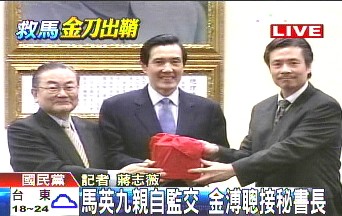 國民黨新舊秘書長交接儀式上,金溥聰從詹春柏與馬英九的手上接下印信,報(bào)道稱,這象征其扛下國民黨這部大機(jī)器的開始。