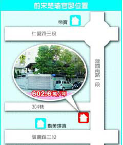 房仲業(yè)者說,這間房地每坪底價222萬余元,多家業(yè)者都出價搶標(biāo),最后被邱寶慧以每坪602萬元、總價7.3億元標(biāo)走,創(chuàng)島內(nèi)住宅區(qū)土地標(biāo)售史上次高紀(jì)錄。