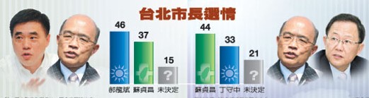 中新網(wǎng)3月4日電 據(jù)臺(tái)灣《聯(lián)合報(bào)》報(bào)道,臺(tái)當(dāng)局前“行政院長(zhǎng)”蘇貞昌表態(tài)投入臺(tái)北市長(zhǎng)選戰(zhàn),調(diào)查發(fā)現(xiàn),未來國(guó)民黨若由現(xiàn)任市長(zhǎng)郝龍斌迎戰(zhàn)蘇貞昌,郝龍斌目前以四成六支持率領(lǐng)先,蘇貞昌獲得三成七市民支持,一成五未決定。