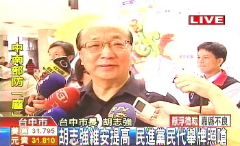 胡志強(qiáng)日前曾遭到一名大學(xué)生亮刀嗆聲,維安問(wèn)題再度被關(guān)注。臺(tái)中市警局?jǐn)M提高維安規(guī)格,比照“直轄市長(zhǎng)”,胡志強(qiáng)表示尊重專業(yè),絕對(duì)配合警方。