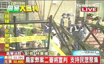 中新網(wǎng)6月11日電 據(jù)臺灣TVBS報道,陳水扁家族涉及的公務機要費、南港展覽館、龍?zhí)顿彽丶跋村X案等案,臺灣高等法院于11日上午二審宣判;高等法院場外聚集了一堆挺扁、反扁民眾等候判決結(jié)果,警方派出大批警力,進行周邊出入管制,嚴防沖突發(fā)生。