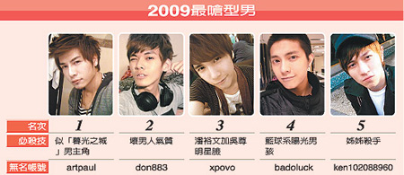 奪得去年年度總冠軍的型男森田是職業(yè)模特兒,曾擔(dān)任“今天你要嫁給我”MV男主角,也拍過電廣告,外型酷似電影“暮光之城”男主角羅伯派丁森。第二名的世新大學(xué)新聞系大三生吳東穎,外型帶點(diǎn)壞男人的味道。他每周會到誠品三、四次,從雜志上得知最新流行信息,參考風(fēng)格。