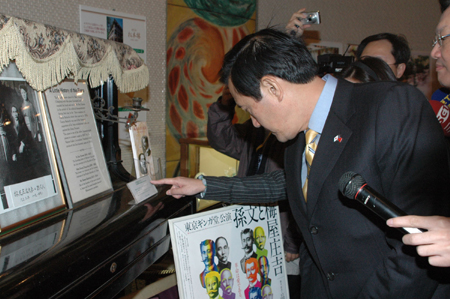 在下午忙碌的活動(dòng)中,馬英九也抽空前往位于日比谷公園內(nèi)的松元樓,參觀與當(dāng)年孫中山先生流亡日本時(shí)有關(guān)的史跡。松元樓現(xiàn)任社長(zhǎng)夫人的祖父梅屋莊吉早年曾對(duì)流亡中的孫中山提供很多的協(xié)助,孫中山是一九一五年在梅屋的家與宋慶齡舉行婚禮的。松元樓的負(fù)責(zé)人親自為馬英九說(shuō)明過(guò)去的這段歷史。
