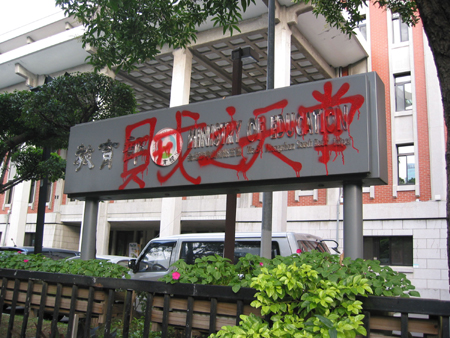 中新網(wǎng)12月5日電 因要拆除臺北中正紀(jì)念堂前“大中至正”這塊招牌,臺灣當(dāng)局“教育部”惹來群眾到現(xiàn)場抗議,結(jié)果連自家牌匾也遭殃,在四日下午被一名男子噴漆辱罵。