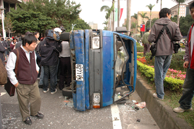 為了大中至正的匾牌,臺北中正紀(jì)念堂整個上午依舊沖突不斷,廣場氣氛異常緊張。為了控制場面,警方在上午十一點多舉牌要求民眾解散。此時,一輛藍色貨車突然在全速沖撞媒體記者的工作區(qū),王瑞璋更遭貨車壓住,現(xiàn)場同業(yè)和民眾趕緊搬起貨車,救出壓在貨車下面的王瑞璋。