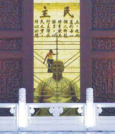 另?yè)?jù)“中廣新聞網(wǎng)”報(bào)道,臺(tái)當(dāng)局“教育部”敲定明年元旦開放臺(tái)灣民主紀(jì)念館(原中正紀(jì)念堂)主館,“教育部主任秘書”莊國(guó)榮表示,全高9.8米的蔣介石銅像不拆,但周圍會(huì)設(shè)置10米高的鋼架。報(bào)道稱,重新開放的臺(tái)灣民主紀(jì)念館2樓蔣介石銅像區(qū),將以“空間解嚴(yán)”的方式規(guī)劃,設(shè)置10米高的鋼架,鋼架上將會(huì)呈現(xiàn)“二二八事件”、白色恐怖受難者姓名、照片、事跡以及許多“人權(quán)運(yùn)動(dòng)者”的努力。往后民眾將無法完整觀看銅像,只得通過鋼架間的細(xì)縫,隱隱約約一窺原貌。莊國(guó)榮說,鋼架展設(shè)是由“二二八”和平基金會(huì)規(guī)劃,花費(fèi)約100萬新臺(tái)幣,未來將成為常設(shè)展。
