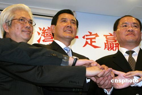 馬英九(中)與其辯護律師將手緊緊搭在一起。中新社發(fā) 董會峰 攝