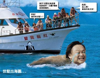 據(jù)臺(tái)灣東森新聞報(bào)道,王世堅(jiān)夸下?,只要“立委”選戰(zhàn)臺(tái)北市國(guó)民黨八仙過(guò)海,拿到所有席次他會(huì)跳海。如今為了這個(gè)承諾,媒體緊迫盯人,生怕一不小心漏掉這則跳海新聞,最新版本則傳出他將在臺(tái)北縣萬(wàn)里碼鋉漁港跳海,雖然未獲證實(shí),但相關(guān)單位都派駐大批人力,前往漁港附近待命以防意外發(fā)生。