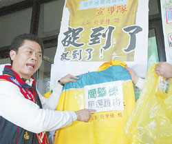 臺(tái)中縣國(guó)民黨“立委”當(dāng)選人江連福涉賄選被起訴,之前他帶著對(duì)手簡(jiǎn)肇棟送給宣傳人員的雨衣(左)到臺(tái)中法院具狀控告簡(jiǎn)肇棟賄選。(中國(guó)時(shí)報(bào)圖)