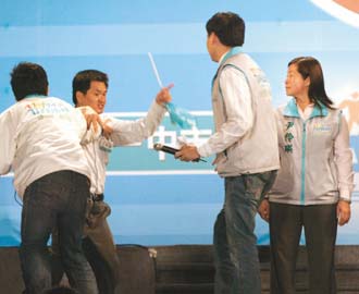 謝長廷18日在云林舉辦造勢晚會,執(zhí)行總干事李應(yīng)元介紹前“臺聯(lián)黨”“立委”尹伶瑛(右)加入民進黨時,一名民進黨支持者(左二)沖上臺辱罵尹伶瑛。(圖:臺灣《聯(lián)合報》)