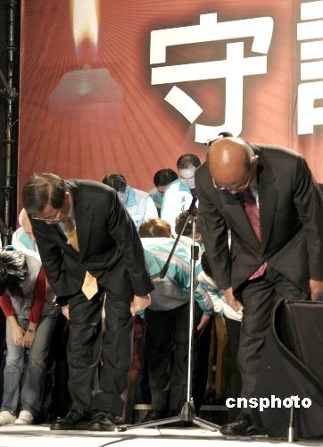 中新網(wǎng)3月22日電 據(jù)臺灣東森新聞報道,民進黨輸?shù)?008年“大選”,謝蘇配大敗,得票與對手馬蕭相差超過220萬票,謝長廷7點半上臺,向支持者致歉和致謝。
