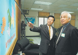 曾當(dāng)過老師的金門縣長李炷烽(左)重拾“教鞭”,指點(diǎn)臺“考試院長”姚嘉文(右)金門與對岸廈門的地理位置。(圖:臺灣《中國時(shí)報(bào)》)