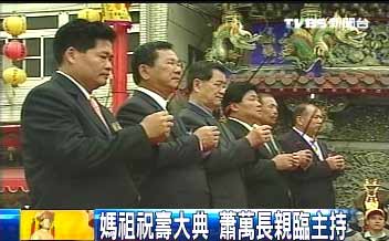 身為嘉義子弟的蕭萬(wàn)長(zhǎng),在家鄉(xiāng)奉天宮感性致詞,感謝媽祖的保佑、民眾的支持,讓“大選”順利進(jìn)行,并祈求兩岸和平。
