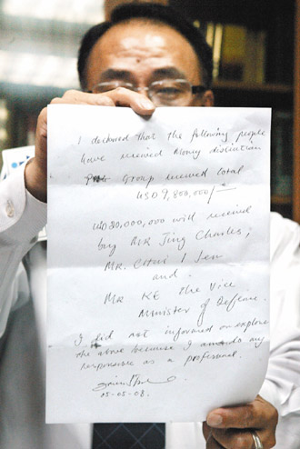 徐景星表示,六日晚上七點(diǎn)半臺(tái)北“地院”正在開(kāi)吳思材的聲押庭時(shí),一位自稱(chēng)是吳思材朋友的人打電話(huà)約他出來(lái),交給他一迭當(dāng)事國(guó)官員分別和黃志芳、邱義仁見(jiàn)面的照片;晚上十一點(diǎn)多吳思材被羈押后,又有另一人交給他一封吳思材所寫(xiě)的兩千九百八十萬(wàn)美元的洗錢(qián)分配過(guò)程;到了七日(昨天)下午五點(diǎn)多,第三名自稱(chēng)是吳思材的朋友送來(lái)一封信給他,說(shuō)是吳思材交代要給馬英九的信,說(shuō)明整個(gè)建交過(guò)程。