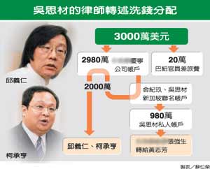 律師表示,邱義仁和金紀(jì)玖兩人事先答應(yīng)吳思材,如果和當(dāng)事國“建交”成功會(huì)給他兩百五十萬美元酬勞,但事后他沒拿到一毛錢;黃志芳又對(duì)吳思材說會(huì)給他一百萬美元補(bǔ)償,還是沒有兌現(xiàn)。