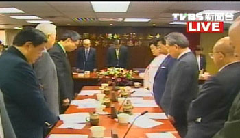 基會(huì)今天(26日)舉行臨時(shí)董監(jiān)事會(huì)正式改組。會(huì)議一開始,江丙坤率團(tuán)隊(duì)先為四川大地震進(jìn)行默哀。(圖:臺(tái)灣TVBS)