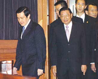 馬英九10晚在5.20后首次出席海基會(huì)臺(tái)商端節(jié)聯(lián)誼活動(dòng)晚宴,與今天赴大陸展開(kāi)兩會(huì)復(fù)談的海基會(huì)董事長(zhǎng)江丙坤一同進(jìn)入會(huì)場(chǎng)。 聯(lián)合報(bào)圖