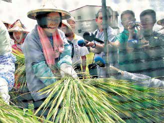中新網6月25日電 民進黨主席蔡英文割稻初體驗,上午在嘉義下田,她還賣力打谷。說不覺得累,是很珍貴經驗,比坐在冷氣房好。稻田主人則對她的表現打了100分。
